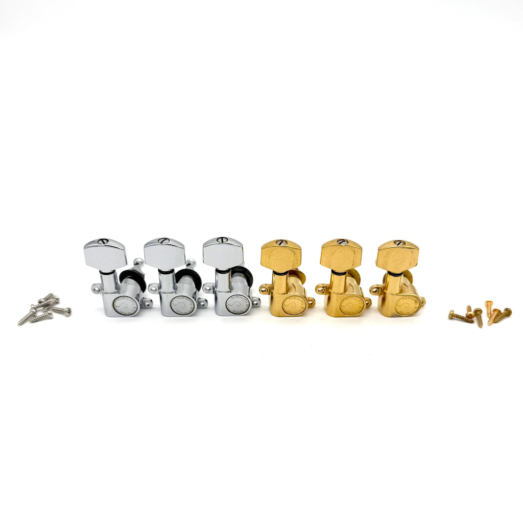 Very Rare Set of Gold and Chrome 6 In Line Schaller “Double Tab” Tuners with bushings, washers and screws.